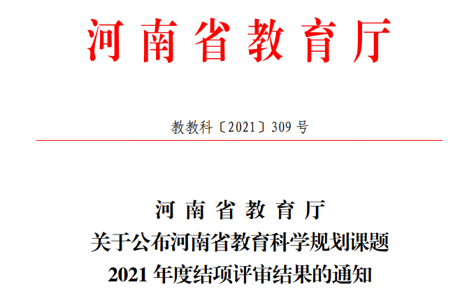 近日,河南省教育厅公布了《2021年度河南省教育科学规划课题结项评审结果的通知》(教教科〔2021〕309号),我校共有4项课题通过了2021年河南省教育科学规划一般课题的结项。由于项目结项要求的提高,望课题负责人今后高度重视项目研究的进展,积极开展课题研究,在规定时间内完成课题调研,提高结项成果的质量,按期结项。