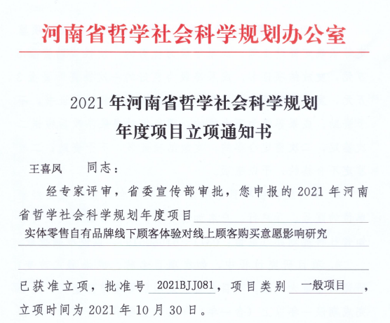 河南省社科规划项目是我省目前最高层次的社会科学研究项目,属于立项难度较大的省部级项目之一。王喜凤老师申报的《实体零售自有品牌线下顾客体验对线上顾客购买意愿影响研究》,通过帮助实体零售自有品牌充分结合线上数据优势、线下场景体验,充分利用双方的各自优势发展独特、特色、新颖的零售方式。