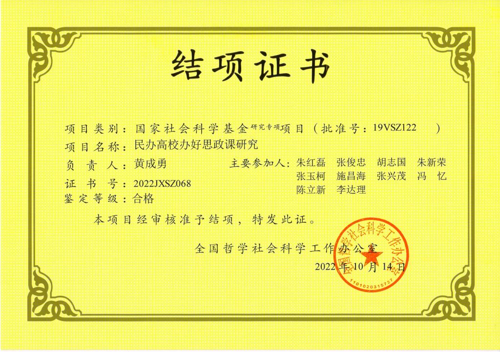 近日,全国哲学社会科学工作办公室公布了国家社科基金思政课研究专项课题的结项情况,我校马克思主义学院黄成勇副教授主持完成的“民办高校办好思政课研究”(编号:19VSZ122)通过了全国哲学社会科学工作办公室鉴定,并顺利结项。