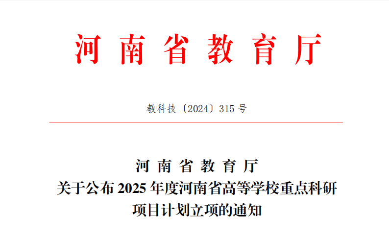 近日,河南省教育厅公布《关于2025年度河南省高等学校重点科研项目计划立项的通知》,我校4项课题获批立项。