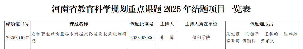 我校马克思主义学院教师张博主持完成的《农村职业教育服务乡村振兴的路径及长效机制研究》项目通过河南省教育科学规划2023年度重点课题结项。