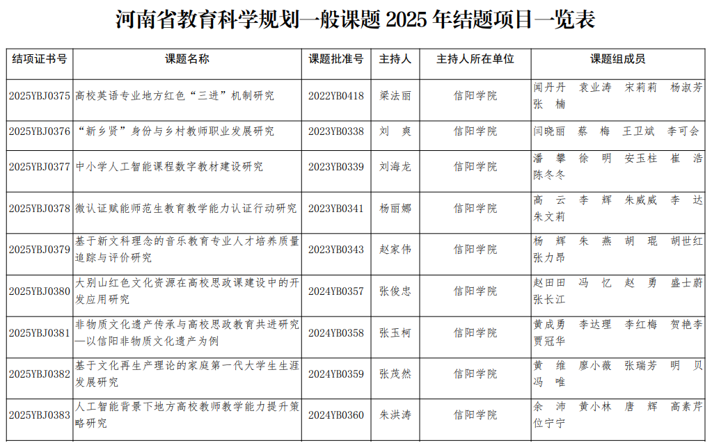 近日,河南省教育厅公布了《河南省教育科学规划课题2025年度结项评审验收结果的通知》,我校共有9项课题通过了2025年度河南省教育科学规划一般课题的结项。