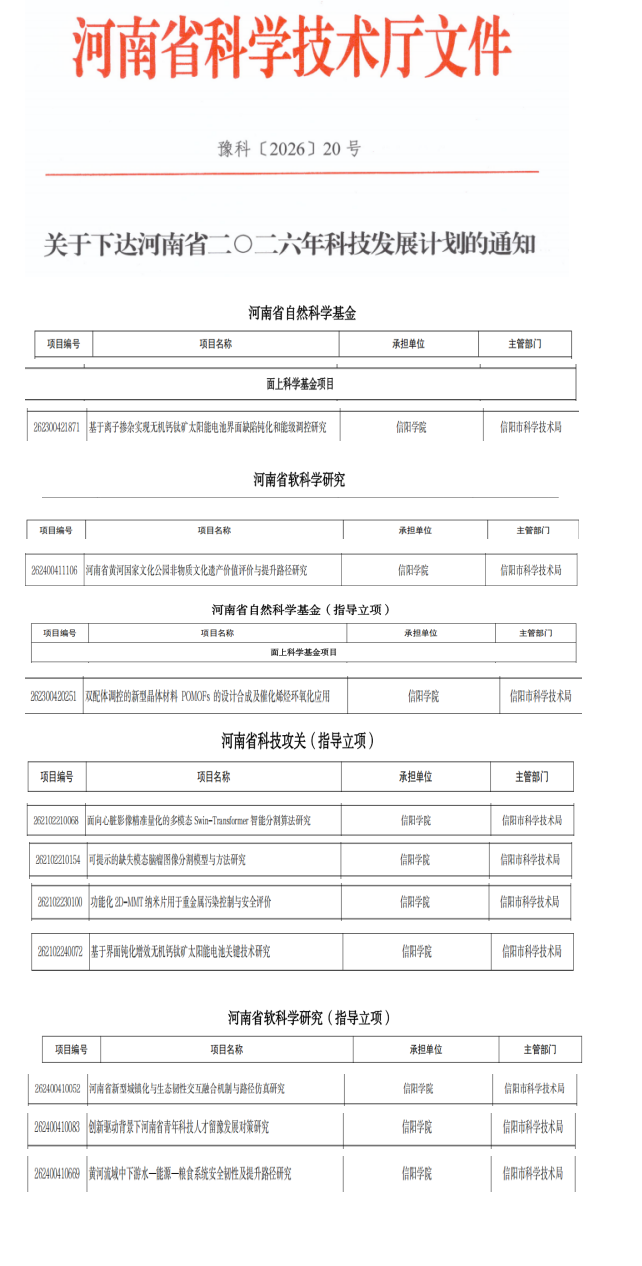 近日,河南省科学技术厅发布《关于下达河南省二〇二六年科技发展计划的通知》(豫科〔2026〕20号),我校10个项目获批立项,其中河南省自然科学基金项目2项,科技攻关项目4项,软科学研究项目4项。